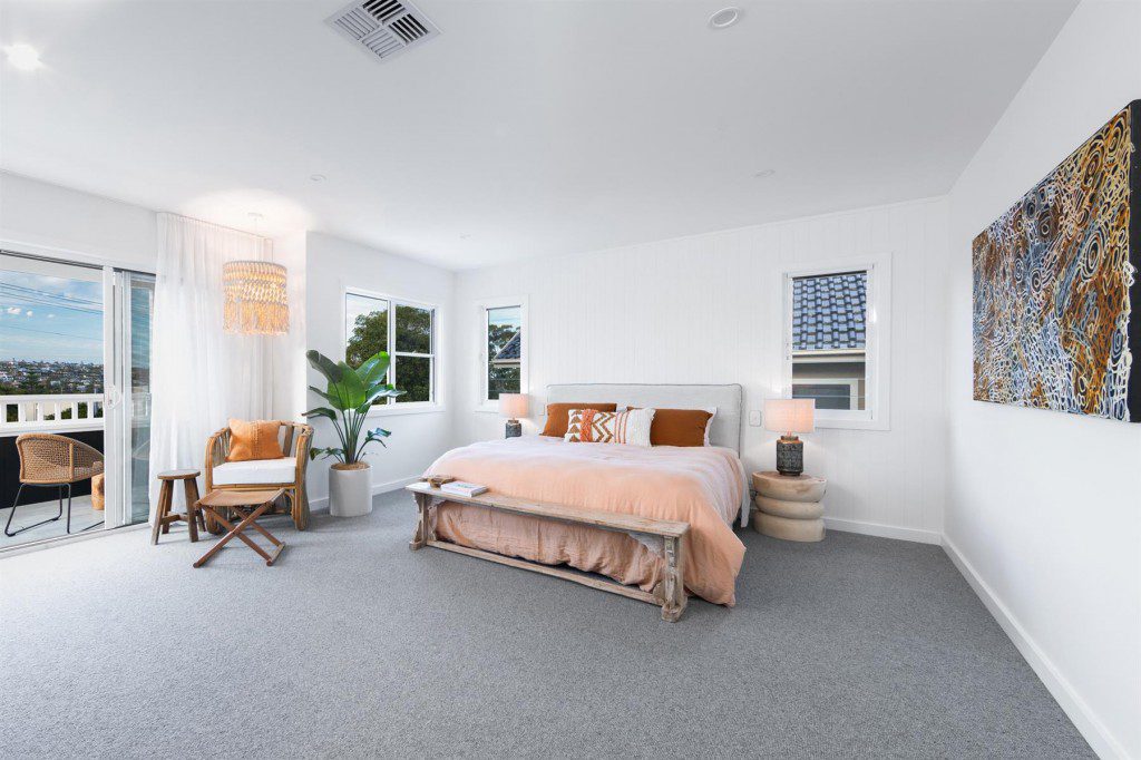 Modern Hamptons design uses classic materials and textures from the traditional Hamptons look, with a contemporary interpretation of the colour palette. This master bedroom adds pops of pink against neutral tones, channeling the coastal, relaxed aesthetic of the Hamptons with the fun-loving Australian personality.