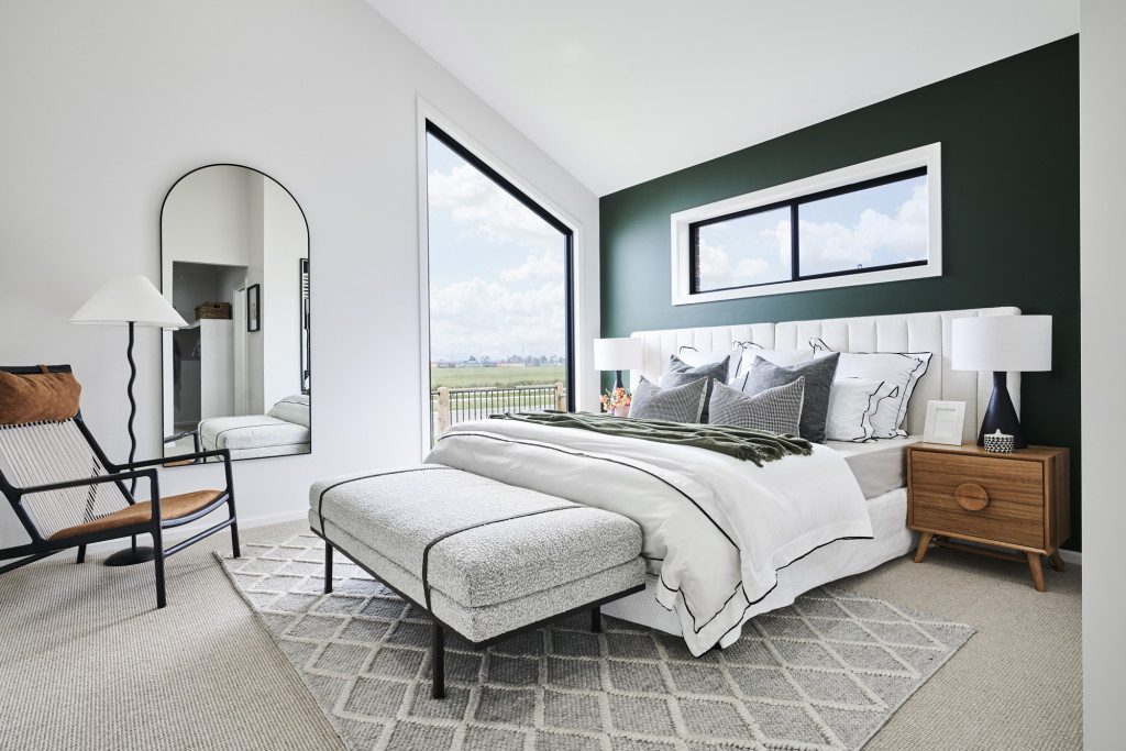 A geometric wood panelled feature wall continues to trend in master bedrooms, providing a dynamic look. Beyond the range of styles and finishes, you can opt for, a wood-panelled feature wall can help absorb sound as well, providing a dually functional and fashionable service.