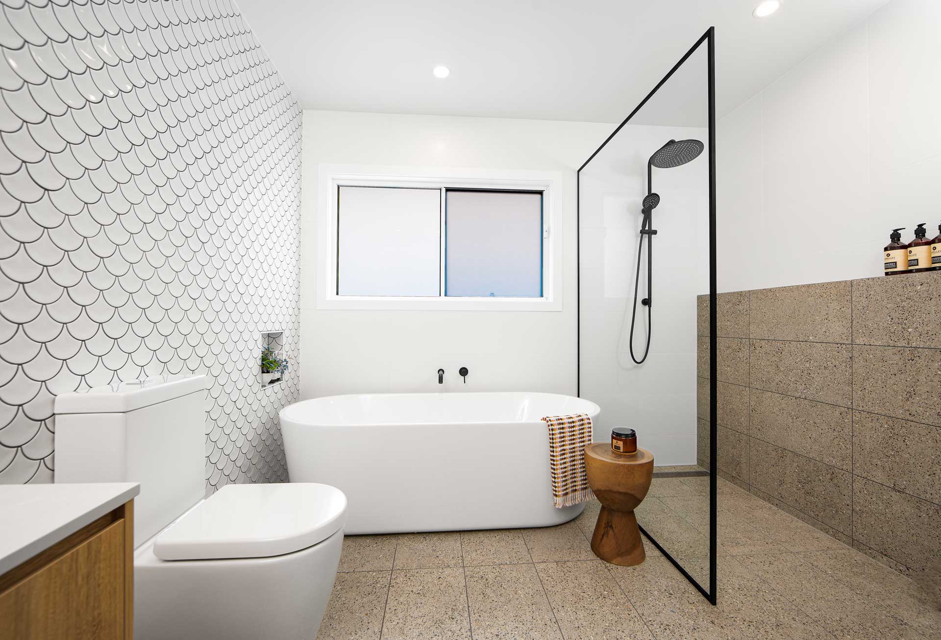 Perhaps one of the simplest ways to add geometric shapes is through your tiling. They’re a great way to impact your bathroom—they’re a fantastic design feature that will give your bathroom character, and something you need to consider when designing.